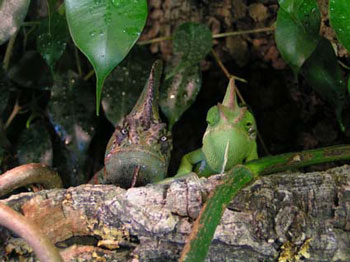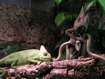 Bevor ich weitere Ausführungen mache, möchte ich zwei Bilder vorstellen, die eine "Ausnahme" zeigen, wie sie in der Natur wohl kaum vorkommt. Zwei meiner Jemenchamäleons lebten ca. 8 Monate friedlich zusammen. Die Bilder sprechen für sich, jedoch bleibe ich ein Vertreter der Einzelhaltung. Mittlerweile leben beide wieder in getrennten Terrarien.